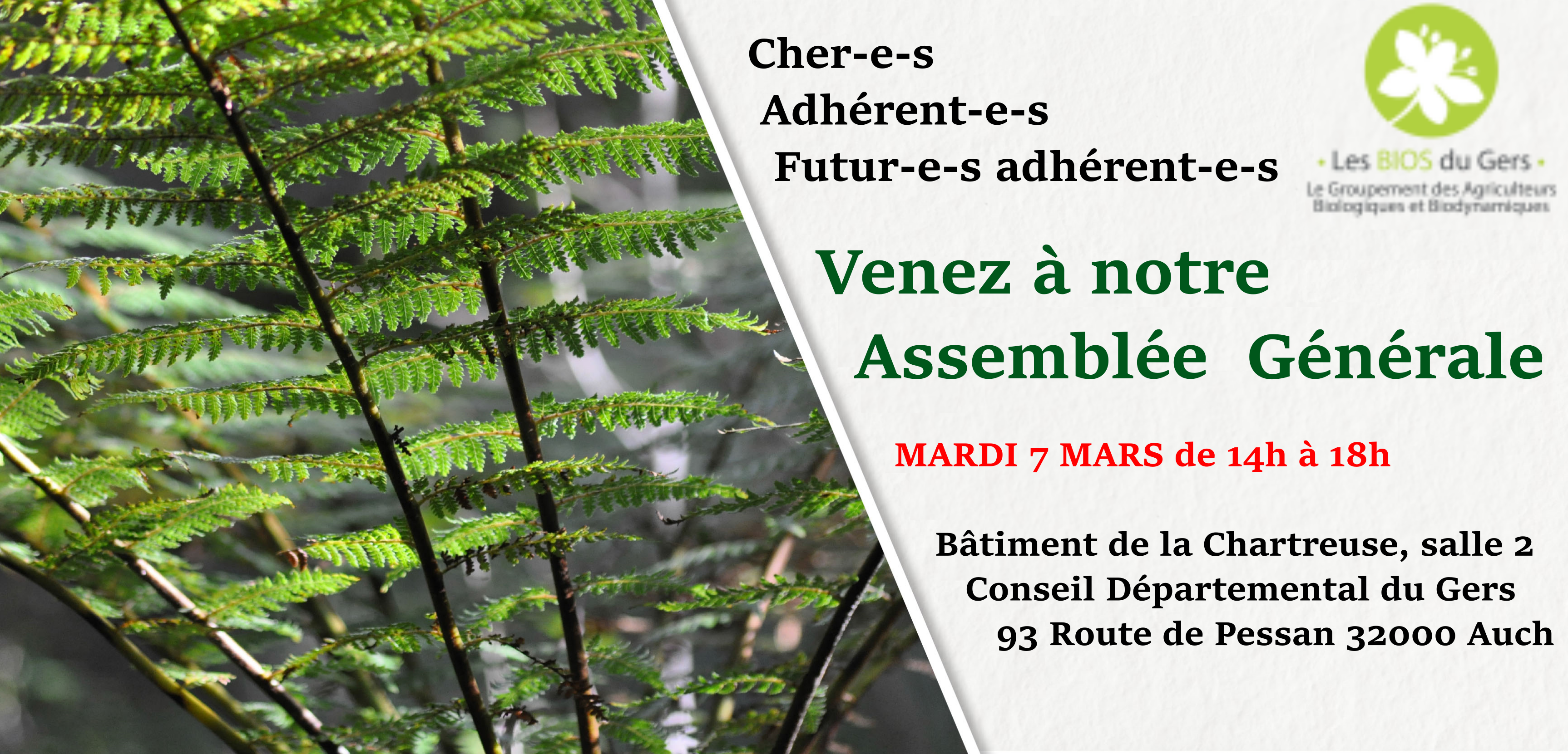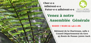 Notre Assemblée Générale aura lieu mardi prochain 7 mars 14h à la « Cité des Transitions Énergétiques et Écologiques », Bâtiment de la Chartreuse, salle 2 au Conseil Départemental du Gers, 93 Route de Pessan 32000 Auch