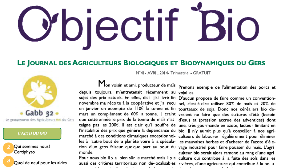 Cette revue est un bulletin d’informations du Gabb 32 qui est envoyée par courrier 3 fois par an. « Objectif bio » comporte des articles techniques sur toutes les filières, un zoom sur des actualités locales, de l’association, du bio etc…